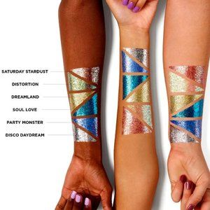 Hyper-reflective glitter is suspended in a water-based, non-sticky gel that glides on easily with a brush or your finger. It's made to go only where you want it to go, and it dries down quickly, stays put for up to nine hours.