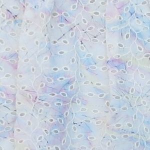 Theory Luvetta Rainbow mini skirt. Worn a handful of times. Luvetta Rainbow Style in rainbow iridescent with allover eyelet embroidery. Pleated A-line style. Hits above knee. Silk. Imported. This print eyelet skirt features ruching and inverted pleats at the waistband. Hidden zip at side. Lined.