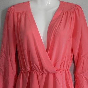 Beautiful coral dress, with a low cut v-neck.