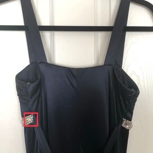 This is an elegant formal gown by the designer City Studio (Size M). Originally purchased from Macy’s, this dress is great for any formal occasion including prom! Only worn twice and in excellent condition. One of the side stones has fallen off (see picture 5) but it is barely noticeable.