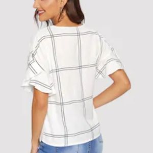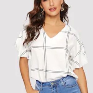 White/black window pane plaid v-neck blouse. So trendy for spring/summer with soft flutter sleeves, can be dressed up or down to complement any outfit! 100% polyester. See last pic for size guide.