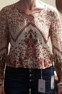 A great boho top!! Long sleeve, flowing gauzy light material great for early spring weather! Hits just below the waistline.