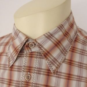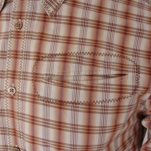 Description: 100% Cotton Beige with browns plaids Western inspired button front long sleeve dress shirt, collar, front chest slit pockets, 2 button cuff, brown stitches detail, back darts.