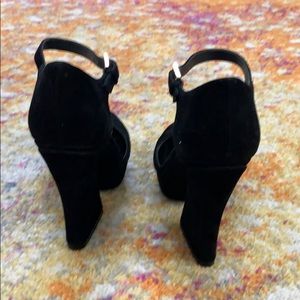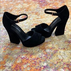 Black suede Alice + Olivia Seric peep-toe platform sandals with covered block heels and buckle closures at ankle straps. Includes box and dust bag. Worn once and in excellent condition