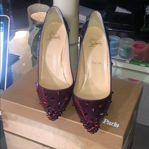 Purple and blue leather Christian Louboutin pointed-toe pumps with spike adornments throughout, tonal stitching, and covered heels.