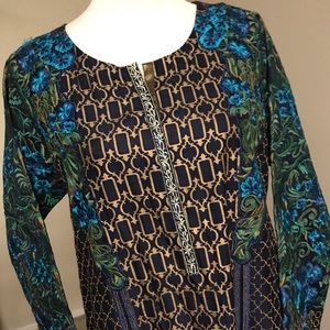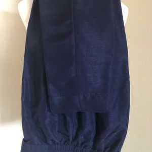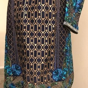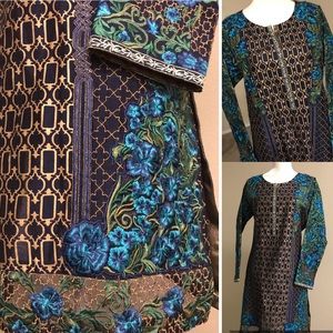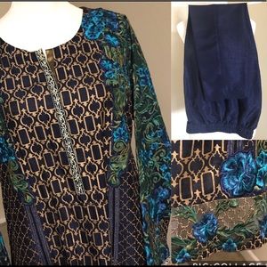 2 piece formal party wear , with machine embroidery and block printing, dark blue colour,copper color finshing on sleeves neck and bottom of shirt. slightly see through from back. Dark blue straight trouser, medium size,