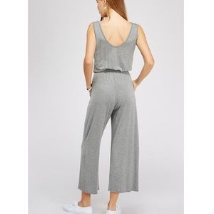 Jersey Knit scoop back jumpsuit. Cropped wide leg. Hip pockets Elastic in waistband w/ spaghetti detail Heavy solid knit jersey fabric