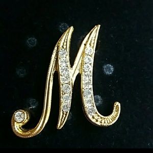 Vintage Gold letter M pin w crystals