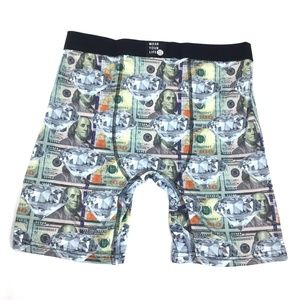 Wear Your Life - A PSD Brand; 2 Pack of Novelty Funny Graphic Print Boxer Briefs Underwear Set; Mens; Medium ( 32 - 34 ); American Flag (patriotic / US / USA) and MONEY (bills / cash); Polyester 90% / Elastane 10%; Breathable athletic feel; Contoured pouch for added support; 9 inch inseam; Wide soft elastic waistband; Trendy Hip Stylish; Tag Free; Great gift idea for Teens, Easter, Father's Day, birthdays, Christmas, Hanukkah