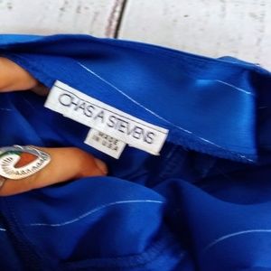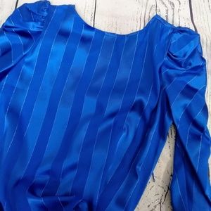 Gorgeous electric blue slinky polyester midi length 80s dress with ruched, structured sleeves and back split. Excellent vintage condition (there are loops for a belt) Chas A Stevens dress (Chicago department store) Bust 38' waist 35' hips 38' length 40' weight 0.8 lbs. Model is size 2 and 5'7.