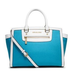 Pre Loved Michael Kors Large Zip Top Satchel. With removable shoulder strap and Michael Kors cloth duster bag. Perfect for summer! Please let me know if you have any questions.