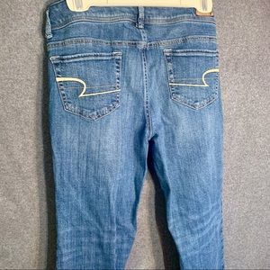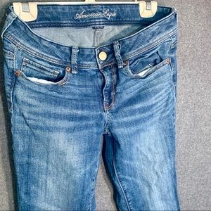 Hey, thanks for checking out this listing. Up for sale is a Pair of American Eagle stretch boot cut denim jeans. Pants are like new and and ankle cuffs are not worn out.