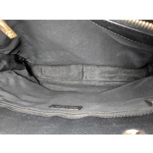 This authentic Chanel black leather tote is in vintage pre-loved condition. While there is minimal wear to the exterior, there is minor rubbing on the corners. The strap leather has been reinforced on two chains straps. There is slight tarnishing on hardware. The interior is damaged with thin tears the fabric at the bottom and middle interior pocket.