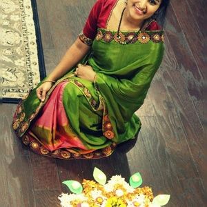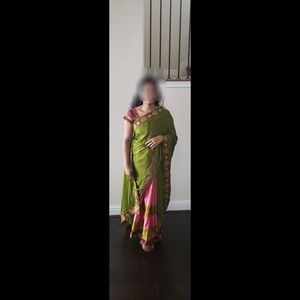 Beautiful mehendi green sari from India. It is half and half style. Please see my sari pic for reference. Comes with the maroon lace blouse. Blouse size 32-35