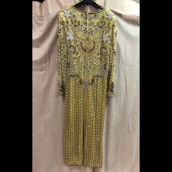 100% Silk. Great Condition. Labeled A6 - would fit today size 12. Missing few beads on back near buttocks as pictured.