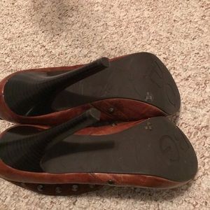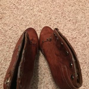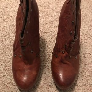 Tan ankle boots with metal detailing. About 4 inches. Never worn but there’s some damage at the top as shown in the last picture.