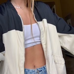 Cute cream and black jacket with front zipper and drawstrings at bottom