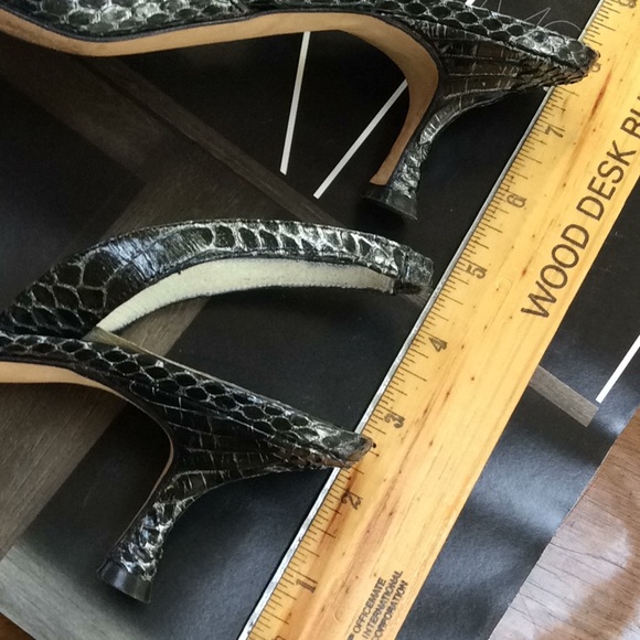 Like new, very gently used and overall in excellent condition. Worn once for an event and stored away. Glamorous black kitten heels sling back with gorgeous rhinestone crystal brooch buckles. Heels not as high as the iconic Hangisi but just as gorgeous. Wonderful walkable heels. Black croc embossed leather with silver accent. The buckles are simply breathtaking. Versatile enough for dressing up or down. Size 41, fits USA size 10. Comes with original dust bag.