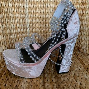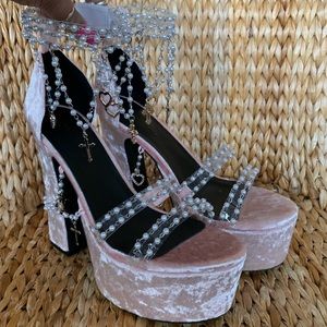 New Holy Revelation pink Platform heels from Sugar Thrillz x Dolls Kill. Pink crushed velvet with pearls, gold, and rhinestone dangling hearts and crosses. Super sexy! Velcro cleat vinyl ankle straps and vamp straps. Sold out style...