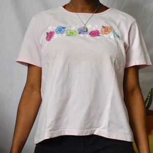 Such a fun tee for the spring & summer! This light pink tee features a banner of hibiscus flowers in bright colors. Print on flowers feature a bandana/paisley inspired design (how cool!). Graphic on tee also features additional smaller flowers.