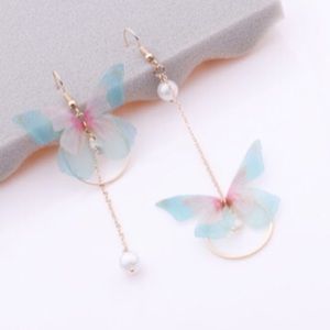 A pair of asymmetrical, long hanging butterfly earrings with a gold tone chain and round loops, synthetic pearls, an delicate butterflies with crystals that reflect the light. Two overlapping butterflies, the bigger one blue, the smaller one pink. One earring the butterfly and other designs are at the bottom, the other earrings they are at the top. Brand new.