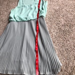 Urban Outfitters, Pins & Needles, pleated skirt dress, size medium. Flirty, sleeveless dress, top mint green with pleated green-gray bottom, skirt is lined. Worn once and in excellent condition.