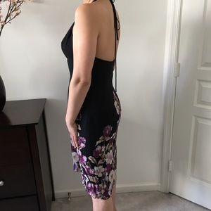 Wow is this dress beautiful or what! I love this designer's charming, elegant styles. This flattering black halter, knee length dress, has a beautiful violet/pastel floral design complimented by glittery embellishments. It has a back zip and the approximate measurements (flat) are: Length: 40" Pit-to-Pit: 17 Waist: 15." It is 100% silk with an acetate lining and is Dry Clean Only. Pre-owned but never worn and in excellent condition.