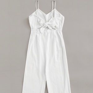 This Bow Tie Back Jumpsuit is a Sweetie. With Spaghetti Straps and an Open Adjustable Bow Tie Back you can Dress it Up for a Warm Summer Night Out, or Down while heading to a Luncheon with Friends