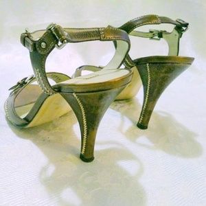 These gorgeous heels are made by Ann Klein and are a size 7M. The shoes are done in a brinze colored leather with accent stitching along the heel, strap and toe. They are fashioned in a peep toe style with a buckle detail along the toe and a slim 4" heel. In beautiful condition!