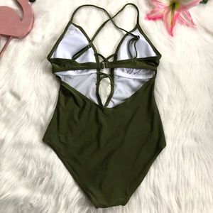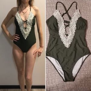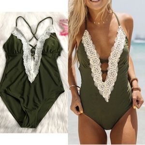Crochet Lace Deep Plunging V Green Monokini Bathing Suit. A one piece monokini with a deep plunging V neckline and intricate crochet lace trim. Crisscrossing adjustable straps with hook back closure. Padded with removable cups with a high rise back, no crack action! The perfect bathing suit you can wear around your friends at the beach or around family without letting everything out. NEW from manufacture, no tags, ready to ship!