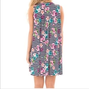 The tight horizontal stripe pattern in rich navy and crisp white is contrasted with a splash of florals in shades of aqua, violet, and blush. Throw on a skinny white waist belt to add some shape, or keep it loose and flowy for maximum comfort.