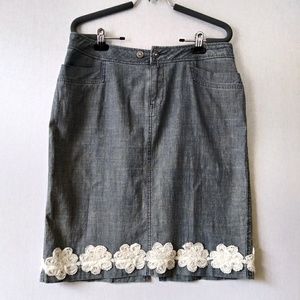 Denim/cotton skirt that has white flowers along the hem as decoration. Has a small slit in the middle of the back as well. Used, but in great condition!