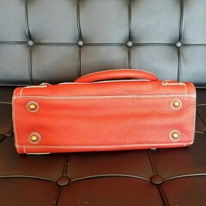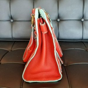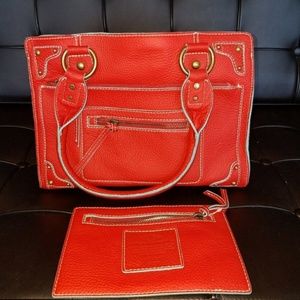 J.Crew Collection Peyton handbag and snap-out wallet / clutch in poppy red with aqua trim (item 87381, also called the "small Anya" at one time). Leather tumbled by Borge Garveri for J.Crew. Used 2-3 times. Catalog pic of yellow satchel is for sizing reference.