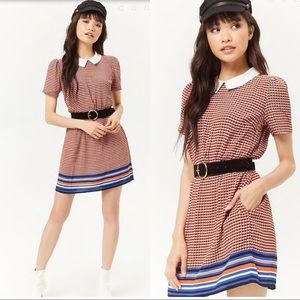 A woven mini dress featuring an allover multicolor houndstooth pattern, contrast Peter Pan collar, short sleeves, darting at the bust, shirring at the shoulders and elasticized waist, back keyhole with button-loop closure, and a contrast banded striped hem.