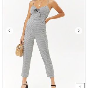 A gingham woven jumpsuit featuring a sweetheart neckline with a knotted front, adjustable cami straps, slant front pockets, a smocked back, cropped straight leg, and concealed side zipper with hook-and-eye closure.