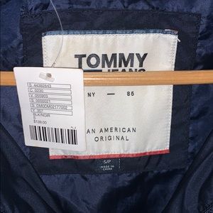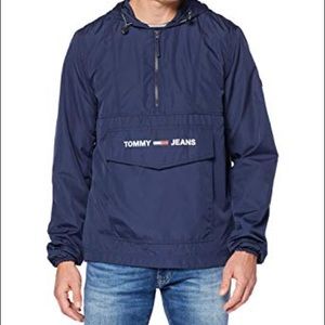 Tommy Jeans popover navy windbreaker. The left side has a zipper that zips half way up, pockets for hands, pouch above, and half zip chest. Brand new with tags 💙❣️