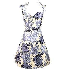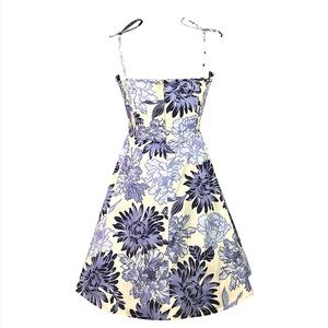 This sweet little A-Line dress is fresh picked for Spring! Beautiful cheery print blooming in shades of blue and ivory. Comfortable stretch cotton fabric. Boning gives the lined bodice it’s gorgeous shape. Special accents include a Rosette at the pleated Sweetheart Neckline and Beads adorning the Spaghetti Straps. Elasticized back for a great flattering fit. Knee length. Back Zip. Handmade in SoCal by Kinny & Howie Retro Boutique.