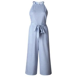Halter Neck, Sleeveless, Striped,Tie Waist, Zipper Closure, Solid Color, Straight Wide Leg,Ankle-length,Elastic Waist,Casual Style
