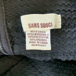 Sans Souci black dress with gold trip. It is a stretchy material with a zipper back.