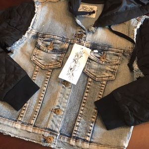 So Nikki Girls Jean Jacket. Slightly distressed and hooded. Sleeves and hood are like a water proof type quilted material. Small and Medium available. Perfect for fall.