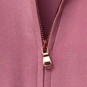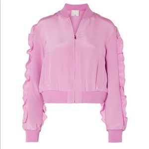 Tibi's Cruise '18 collection is filled with sherbet hues, and the pink shade of this bomber jacket is gorgeous! It's crafted from lightweight silk crepe de chine and has ruffles along the sleeves and back that playfully move as you walk. It's finished with a rose gold zip and ribbed jersey trims.