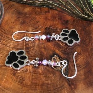 Paw print earrings are a perfect addition to any wardrobe. These earrings feature adorable paw print charms. The other beads are an array of pinks and purples to match. Perfect for that animal lover in your life! We used genuine Swarovski crystals, silver toned accents and .999 silver fish back hooks in creating this design.