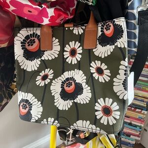 Gorgeous Orla Kiely olive green with orange and pink daisies and poppies. Textured with tan interior. Light brown leather handles. Never used, still has plastic on feet.