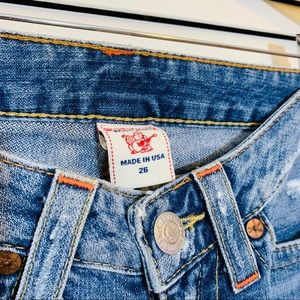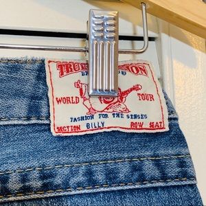 $398 True Religion Patchwork Distressed Jeans