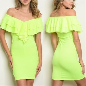 Neon is all the rage this season, so hope on the trends train and grab this NEON dress featuring an fabulous ruffled off shoulder style and sexy bodycon fit!