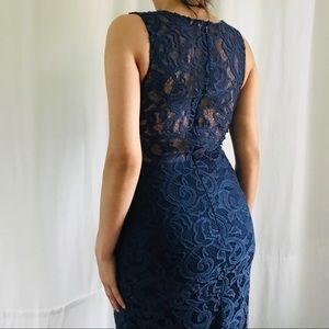 Long form fitting formal lace navy blue dress with sheer lace back and breast patting. Has silver sequence on top body. Has no tears rips or stains. I am 5’7 and weight 140. The dress is a size small and it fits well.