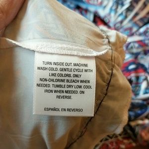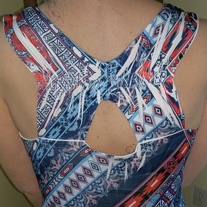 PREOWNED. VERY GOOD CONDITION. NICE COLORFUL RED, WHITE & BLUE PRINT. MOLDED CUPS. CRYSTALS ACCENTS BETWEEN THE BUST. RUFFLE BOTTOM DETAIL. KEYHOLE BACK. APPROX 17" PIT TO PIT AND APPROX 52" L. HAS STRETCH. MARKED SIZE M. POSSIBLY COULD STRETCH A BIT MORE. TAG CUT AWAY. NOT SURE OF EXACT MATERIAL IT DOES HAVE STRETCH TO IT AND IT CAN BE LAUNDERED IN THE WASHING MACHINE.