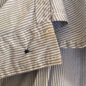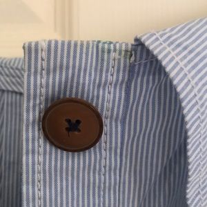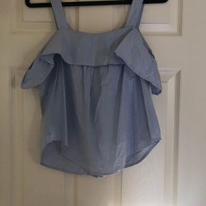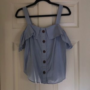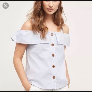 Super cute off the shoulder blouse from Anthropolgie! In decent used condition. Small stain at front under side of placket where the hook/ thread eye is and a little discoloration on the inside. Feel free to ask any questions or make an offer! Thanks!