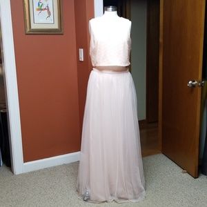 Brand new w/ tags. From a sample sale w/ the sample stamp on the bottom of the top that's not noticeable. Top is sequence w/ a keyhole closing at the top and small slit at the bottom. It measures 17" from shoulder to hemline. 37" bust. Skirt is 2 layers of sheer over a solid satin skirt. Zippers and hooks in the back. Side pockets. 32" waist. 43.5" from waist to hemline. Top layer of sheer has some snags in it and I see where some can be ironed or can easily take off the layer since there's 2.-^