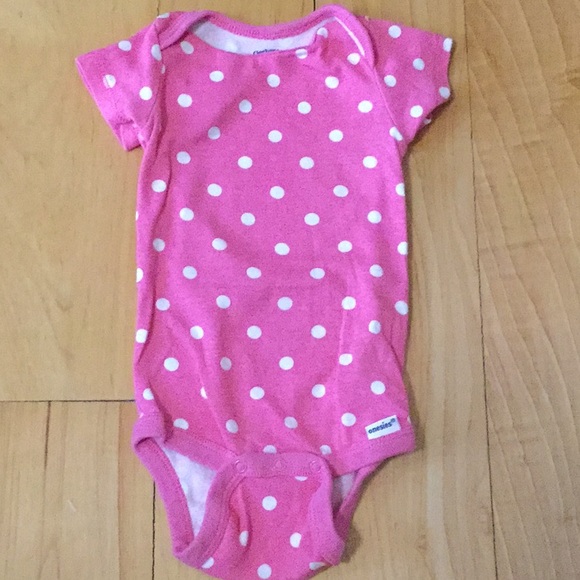 -Gerber pink with white polka dots onesie size 3-9months but fits like 6M.